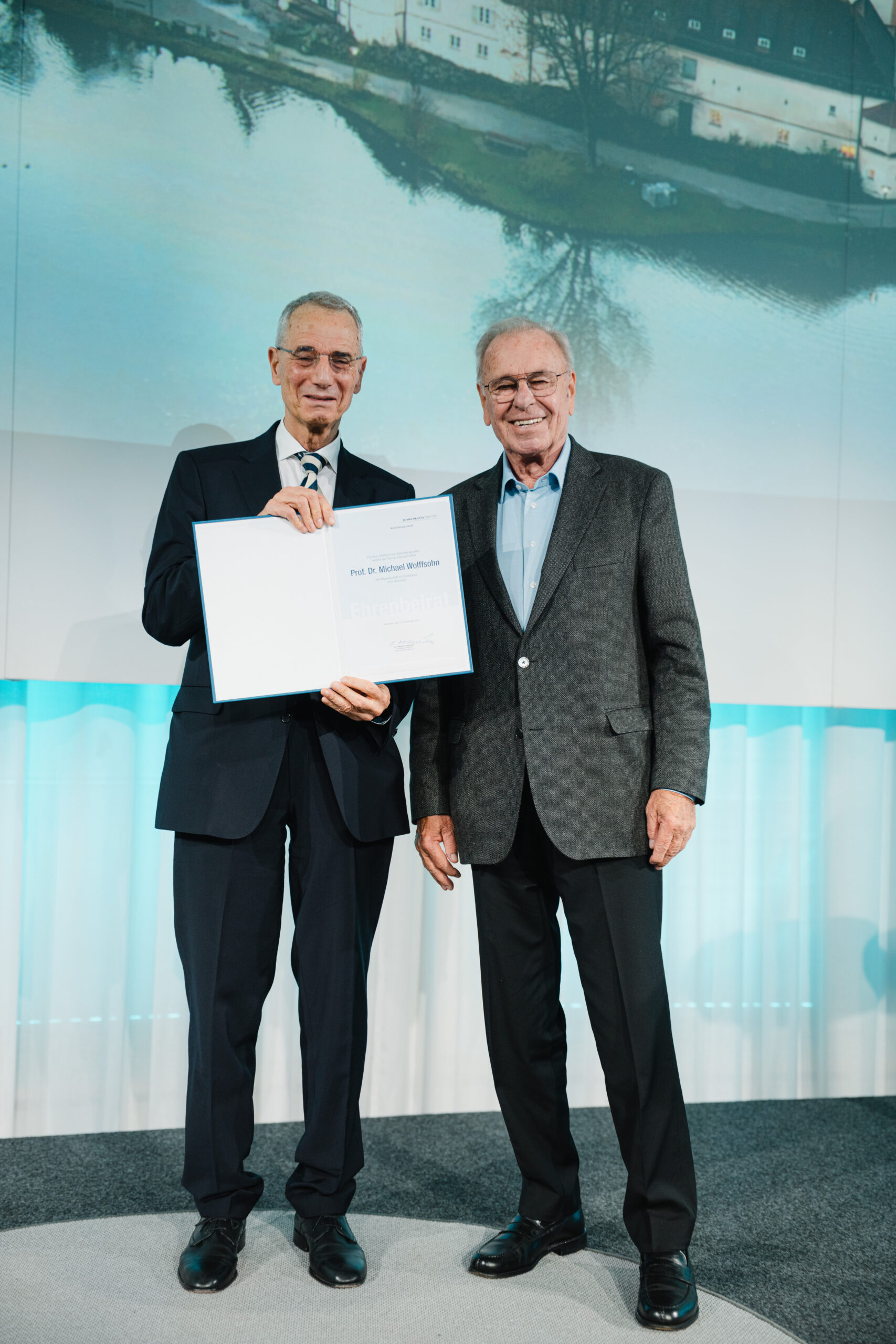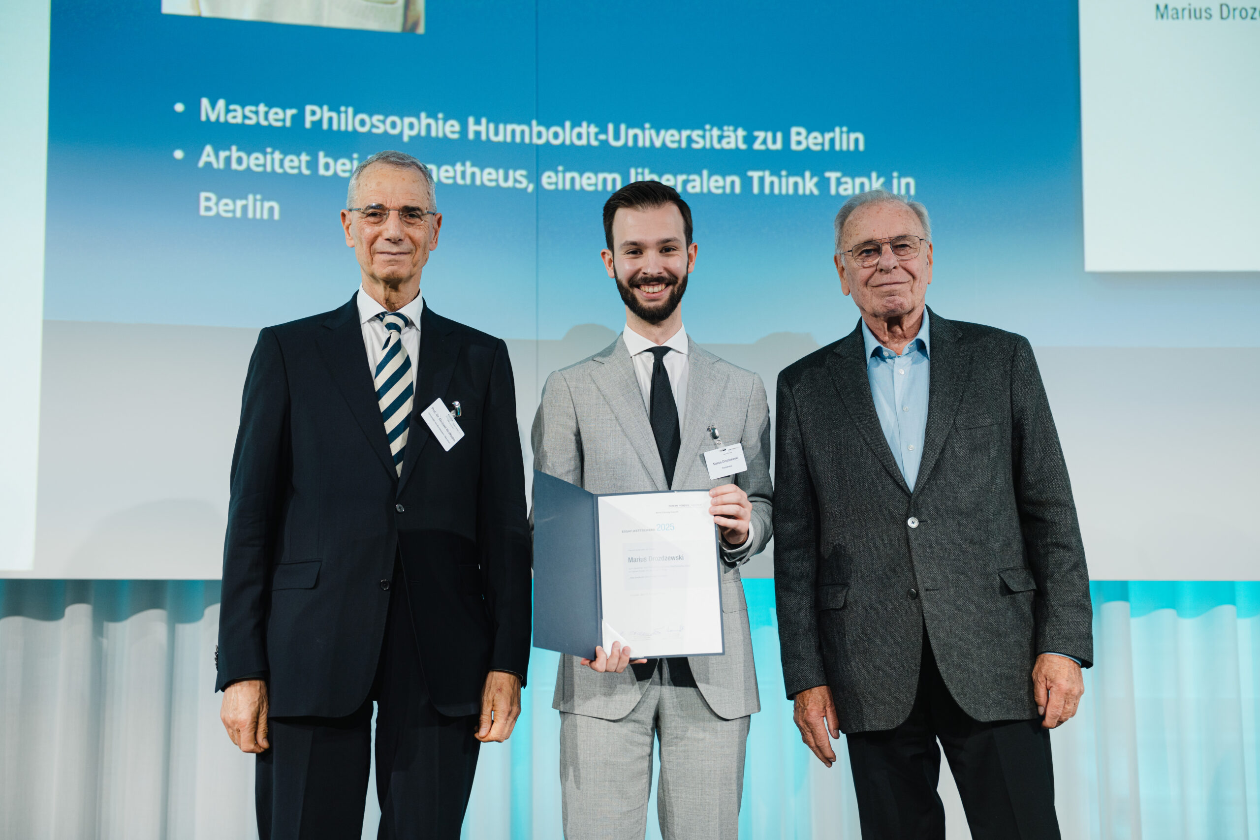 Am Ende der Veranstaltung wurde Marius Drozdzewski als Gewinner des diesjährigen RHI-Essay-Wettbewerbs ausgezeichnet, der zur Frage „Was bedeutet Gerechtigkeit heute?“ ausgeschrieben war. Sein Beitrag ist als RHI-Publikation „Gerechtigkeit anders denken – Vom Nullsummenspiel zur Wachstumsperspektive“ erschienen. Die Laudatio hielt der Historiker Michael Wolffsohn, dem anschließend ebenfalls eine besondere Auszeichnung zuteilwurde: Der RHI-Vorstandsvorsitzende Rodenstock ernannte den renommierten Publizisten und Nahost-Experten zum Mitglied im RHI-Ehrenbeirat.